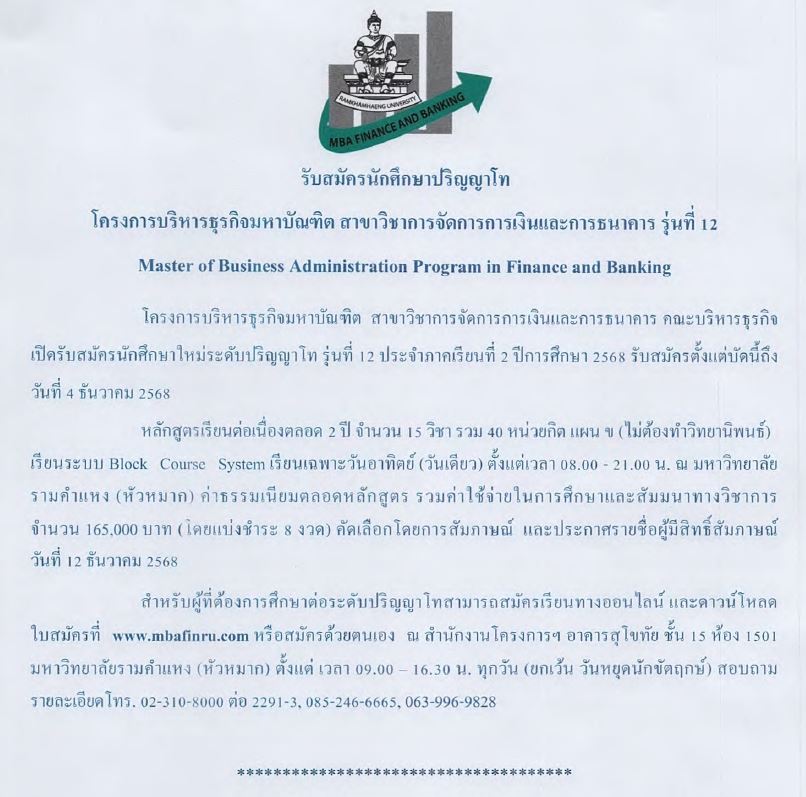 โครงการบริหารธุรกิจมหาบัณฑิต สาขาวิชาการจัดการการเงินและการธนาคาร เปิดรับสมัครนักศึกษาใหม่ รุ่นที่ 12 ภาคเรียนที่ 2 ปีการศึกษา 2568