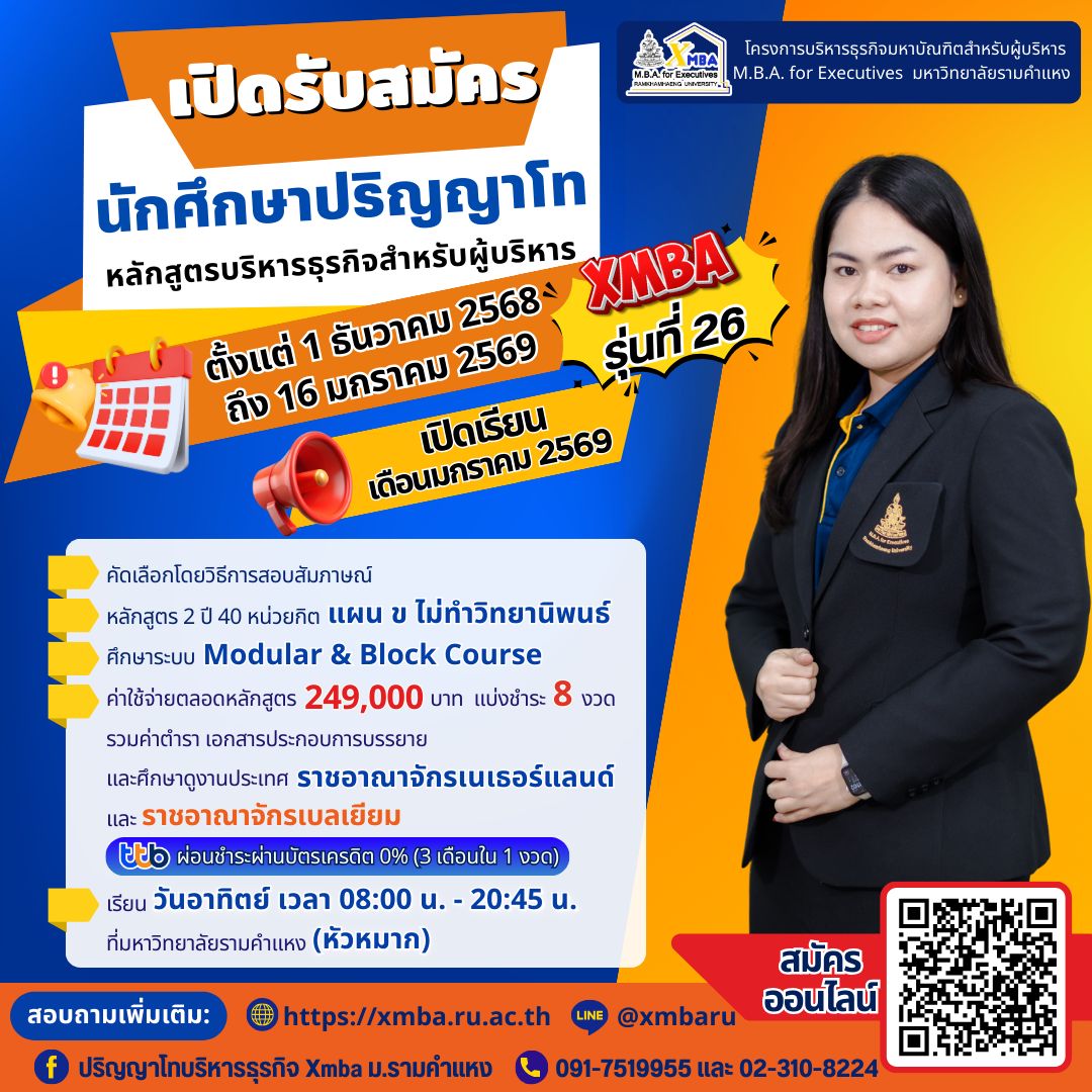 โครงการบริหารธุรกิจมหาบัณฑิตสำหรับผู้บริหาร ขยายเวลารับสมัครนักศึกษาใหม่ประจำภาค 2 ปีการศึกษา 2568 หลักสูตรบริหารธุรกิจมหาบัณฑิต วิชาเอกบริหารธุรกิจ รุ่นที่ 26
