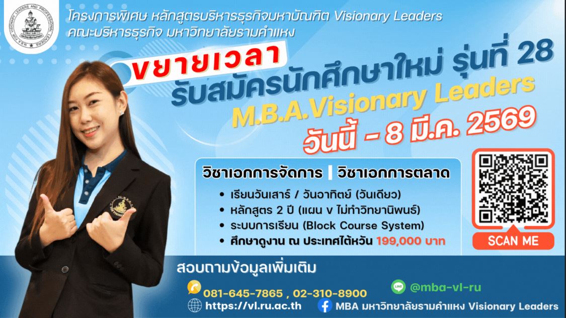 โครงการพิเศษ หลักสูตรบริหารธุรกิจมหาบัณฑิต (Visionary Leaders) ขยายเวลารับสมัครนักศึกษาปริญญาโท รุ่นที่ 28 ภาค 2 ปีการศึกษา 2568