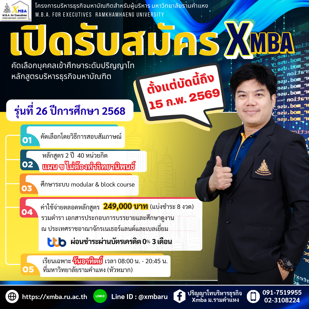 โครงการบริหารธุรกิจมหาบัณฑิตสำหรับผู้บริหาร ขยายเวลารับสมัครนักศึกษาใหม่ประจำภาค 2 ปีการศึกษา 2568 หลักสูตรบริหารธุรกิจมหาบัณฑิต วิชาเอกบริหารธุรกิจ รุ่นที่ 26