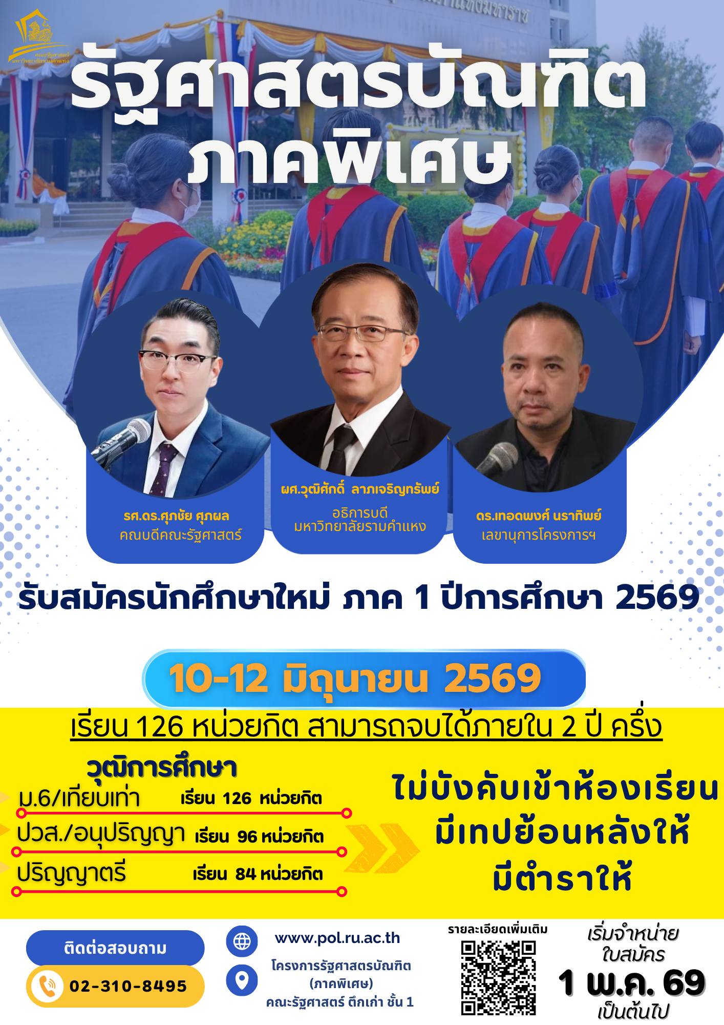 โครงการศึกษาภาคพิเศษ หลักสูตรรัฐศาสตรบัณฑิต เปิดรับสมัครนักศึกษาใหม่ ภาคเรียนที่ 1 ปีการศึกษา 2569