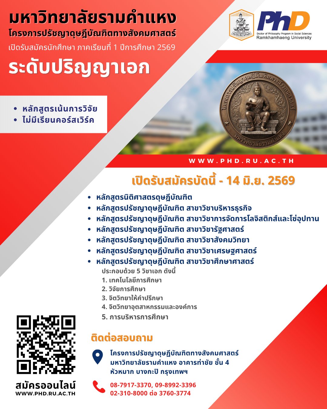 โครงการปรัชญาดุษฎีบัณฑิตทางสังคมศาสตร์ มหาวิทยาลัยรามคำแหง เปิดรับสมัครนักศึกษาใหม่ และกรณีเทียบโอน ระดับปริญญาเอก ภาคเรียนที่ 1/2569