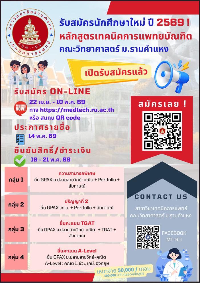 ดูรายละเอียดเพิ่มเติม หรือสมัครได้ที่ >>> https://medtech.ru.ac.th/